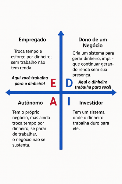 Robert Kiyosaki divide as formas de ganhar dinheiro em 4 quadrantes. Cada lado representa uma mentalidade e um estilo de vida completamente diferente